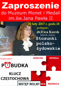 W imieniu częstochowskiego Klucza Pobudki serdecznie zapraszamy na spotkanie z dr Ewą Kurek, które odbędzie się w dniu 24 lutego br. (piątek) o godz.18:00 w sali Muzeum Monet i Medali im.św.Jana Pawła II. Tematem spotkania będą: „Stosunki polsko-żydowskie”.