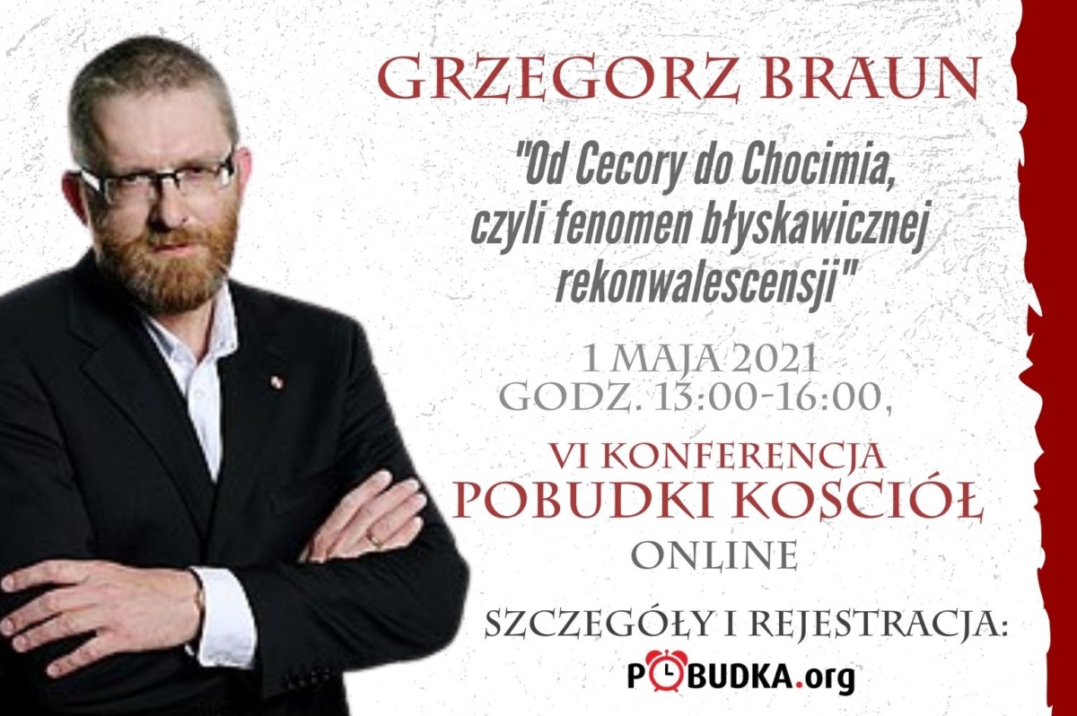 Punktem kulminacyjnym naszej jutrzejszej Konferencji Pobudki Kościół będzie prelekcja Grzegorza Brauna pt.: „Od Cecory do Chocimia czyli fenomen błyskawicznej rekonwalescencji”